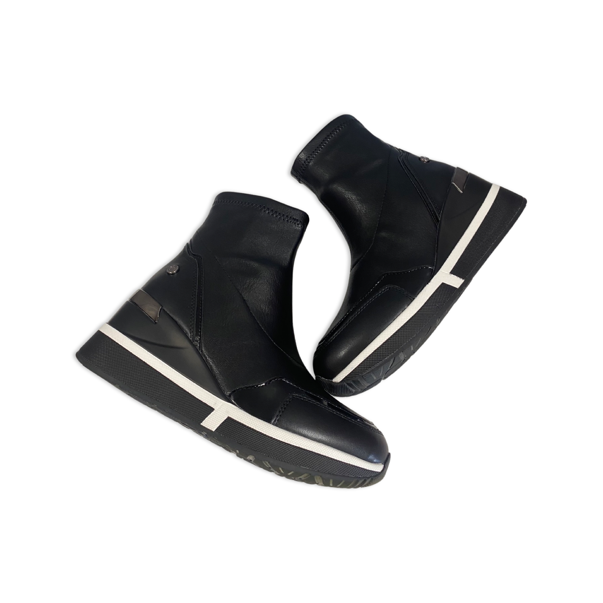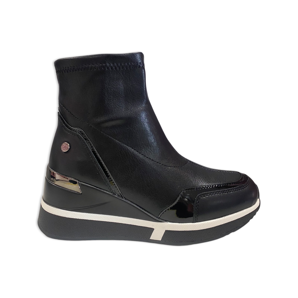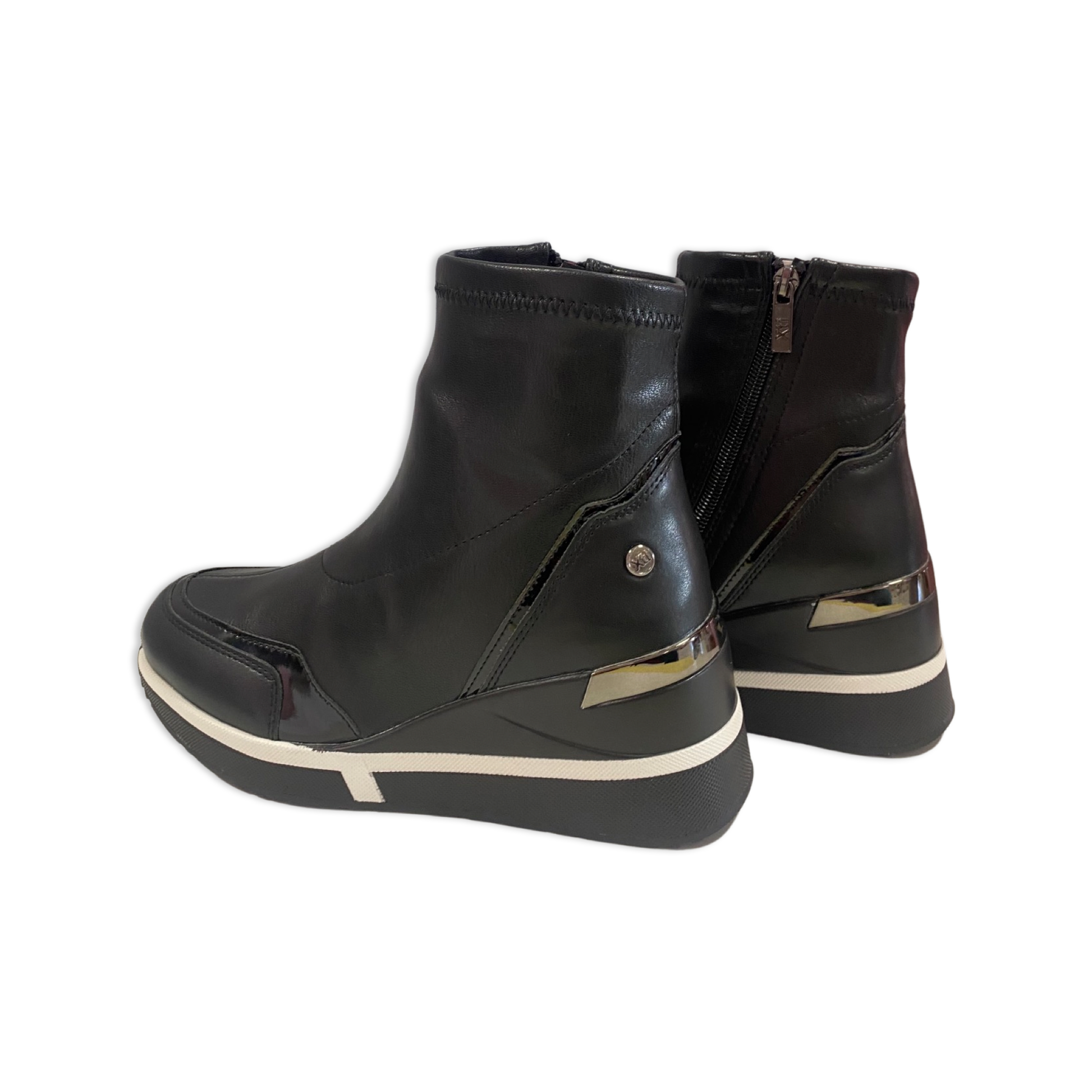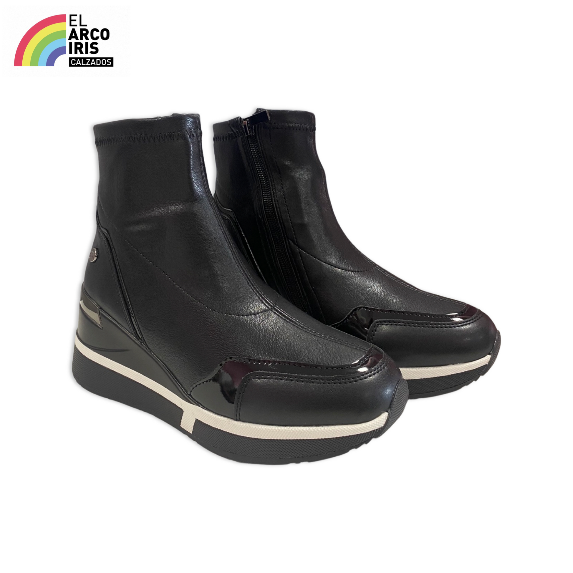 Botín deportivo de mujer, de la marca Xti. Fabricado en material que imita la piel elástico. Cierre mediante cremallera lateral. Luce un look casual y añade unos centímetros con esta cuña de 6 cm. Suela de goma antideslizante. Este modelo ha obtenido el certificado vegano por la organización mundial PETA (Organización de los derechos de los animales).