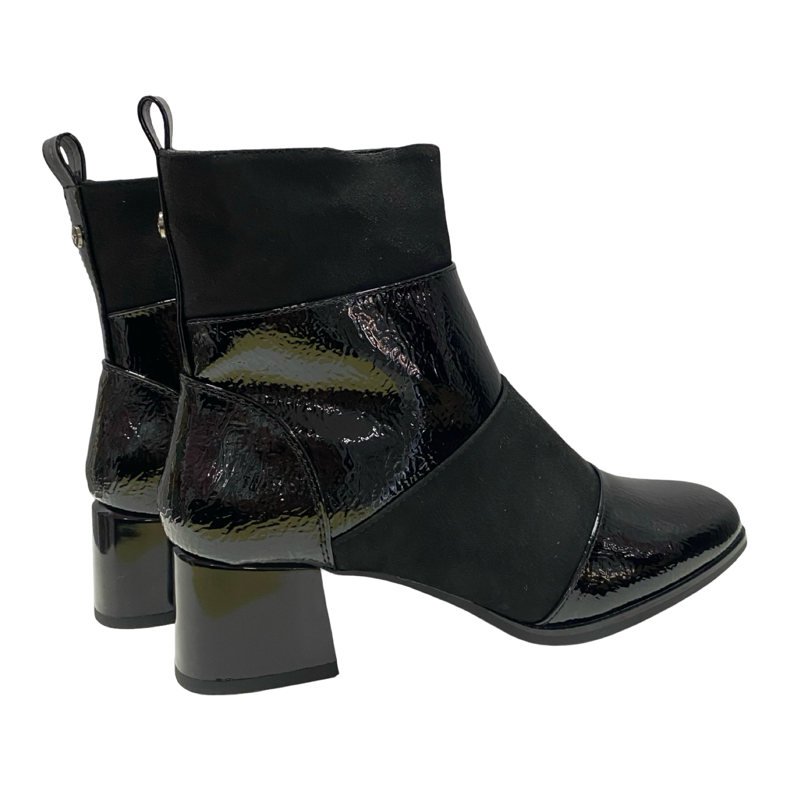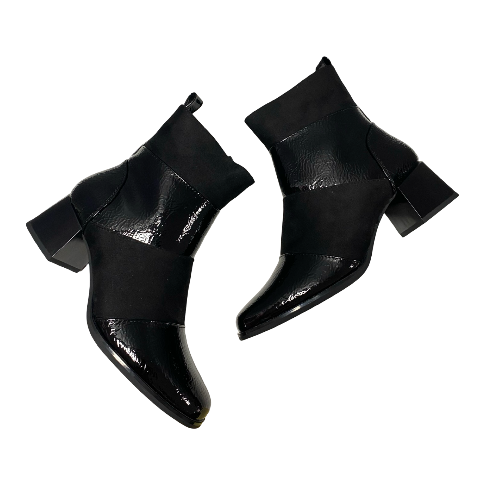 Descubre el botín perfecto para cualquier ocasión, combinando charol negro y ante en tonos elegantes. Con un tacón de 4 cm que brinda comodidad sin renunciar al estilo, este botín aporta un toque chic y divertido a tu look. ¡Atrévete a destacar con cada paso!