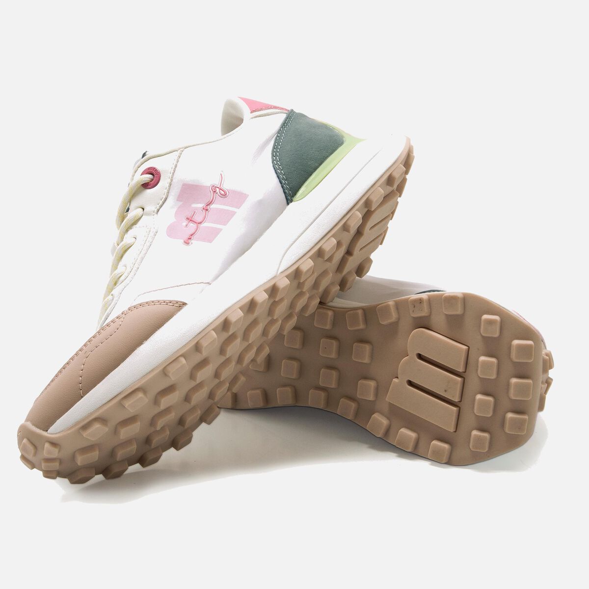 Zapatillas blancas Zinc de mujer de la marca Mustang. Estas zapatillas destacan por sus detalles en tonos verde y rosa, dándoles un toque de color. La suela gruesa y el diseño acolchado proporcionan comodidad. Las deportivas Zinc de Mustang son perfectas para añadir estilo a cualquier look.