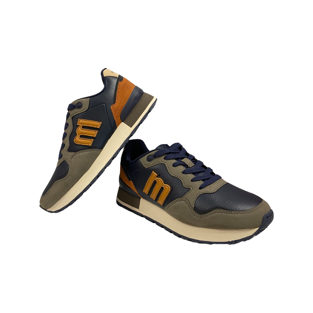 Zapatilla deportiva joggo classic para hombre. Con diseño en una combinación de color azul marino y kaki. Suela bicolor dentada. Logo de la marca en el lateral. Detalles color naranja. Cierre de cordones planos azul marino. Paneles con diferentes texturas. Actualiza tus looks deportivos de la mano de Joggo.