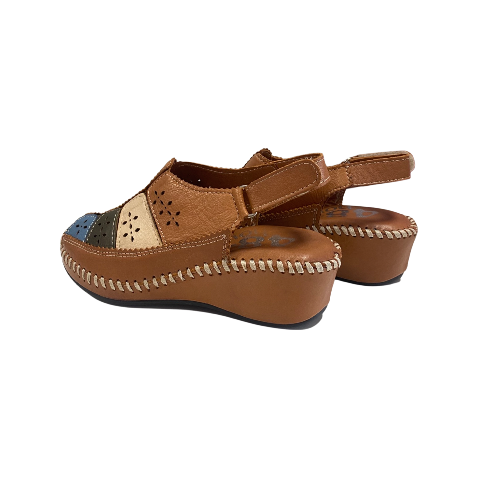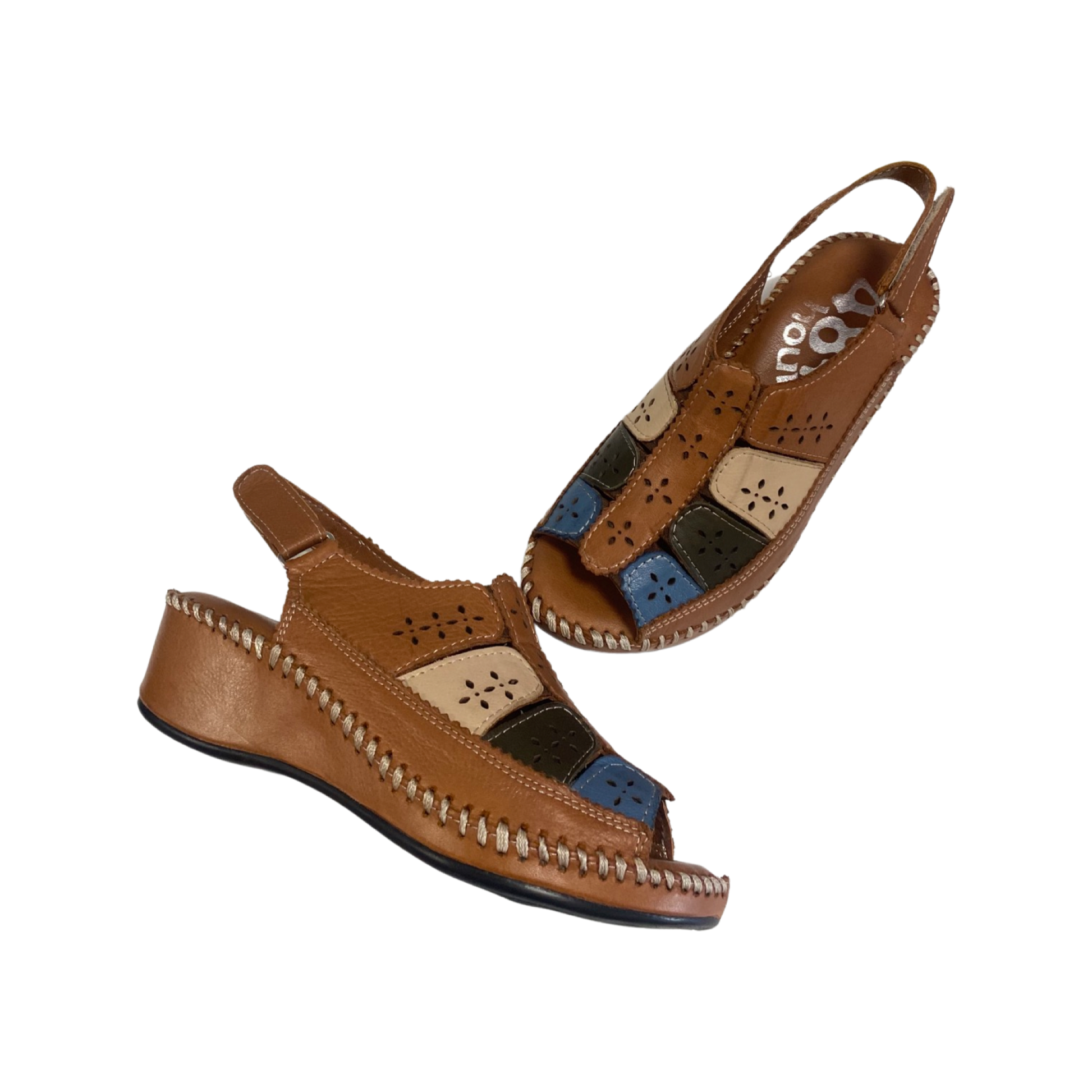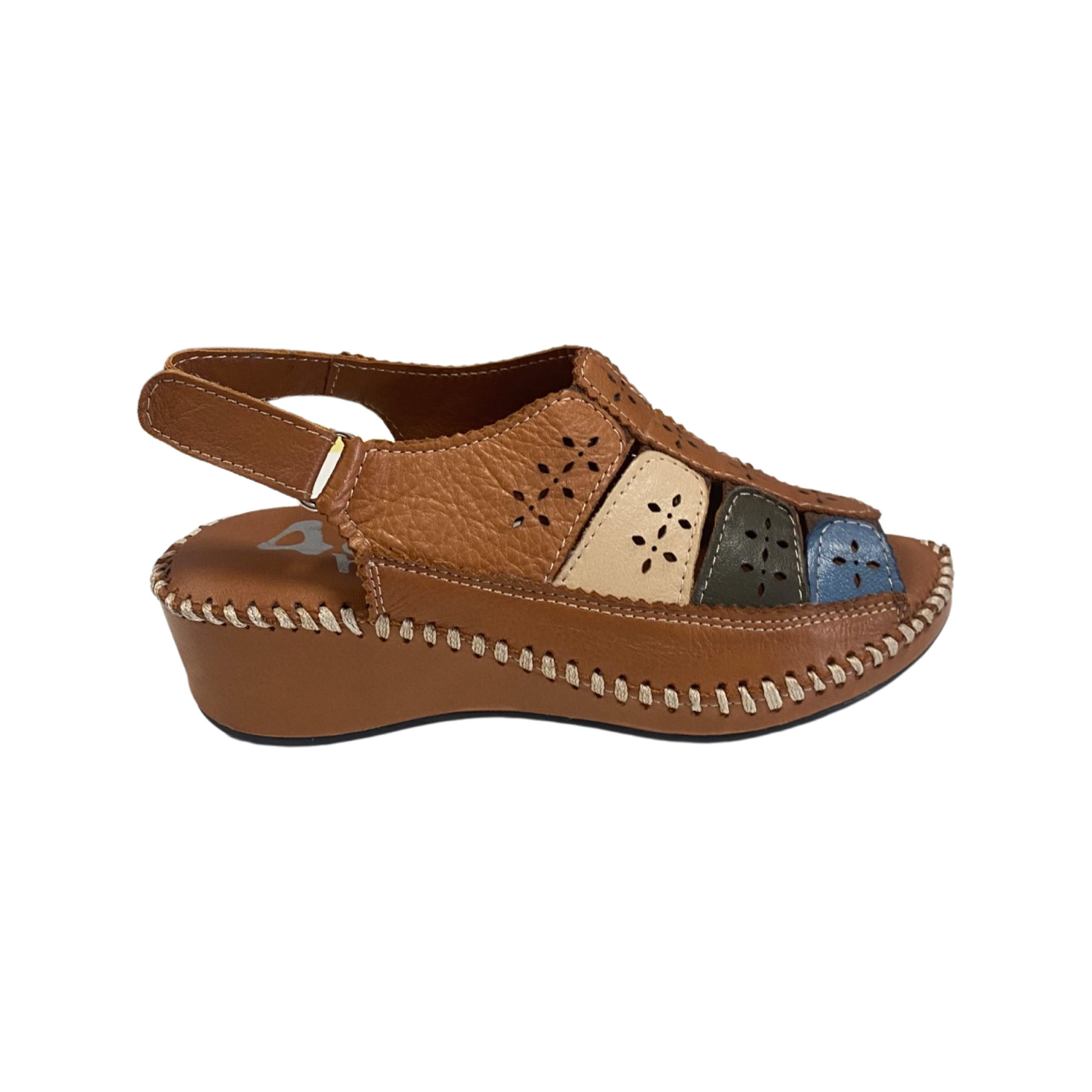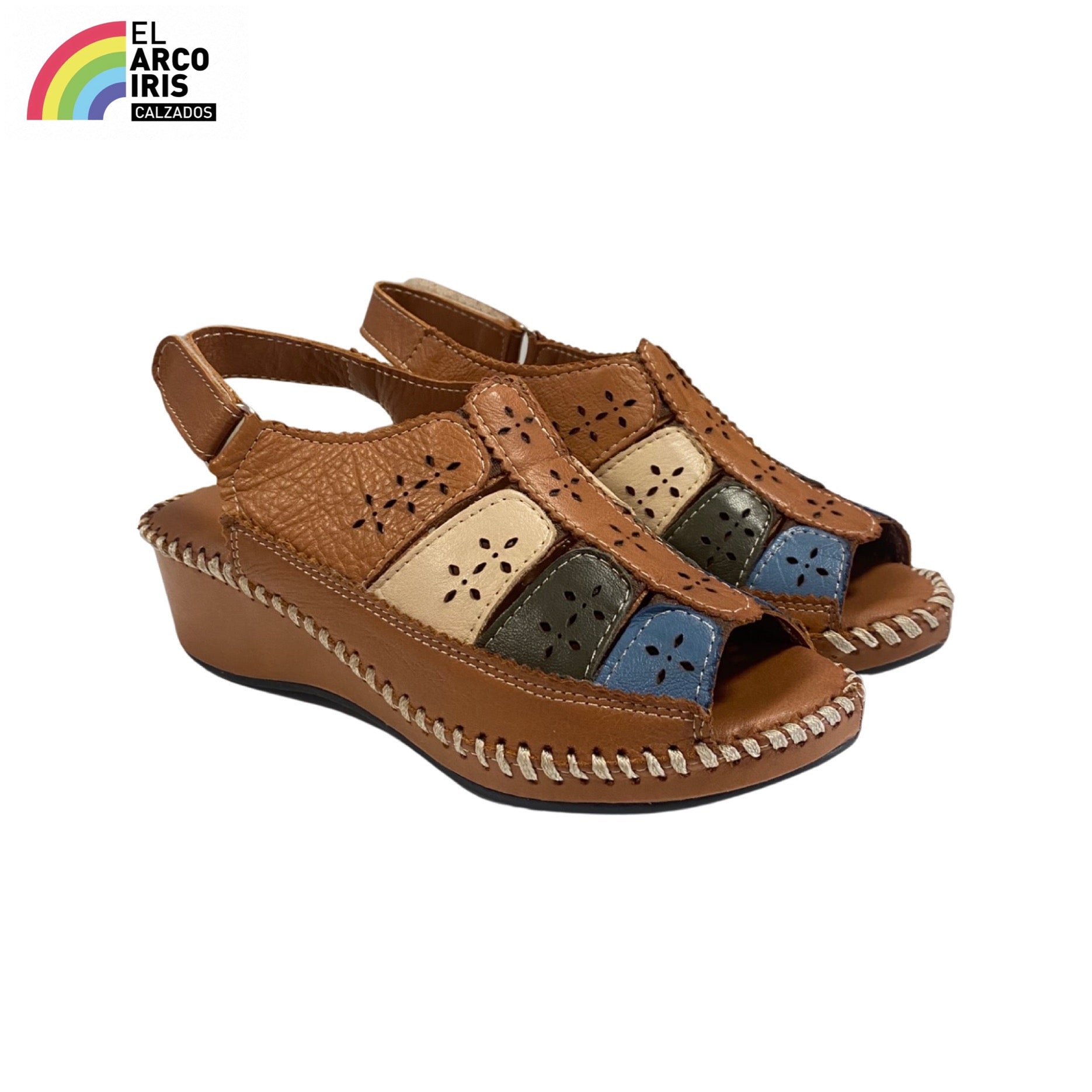 Sandalia de cuña para mujer de 48hrs. Una sandalia que viene en piel picada haciendo dibujos de flores. Su combinacion de colores lo hace combinable con cualquier look. Plantilla ligeramente acolchada de piel.