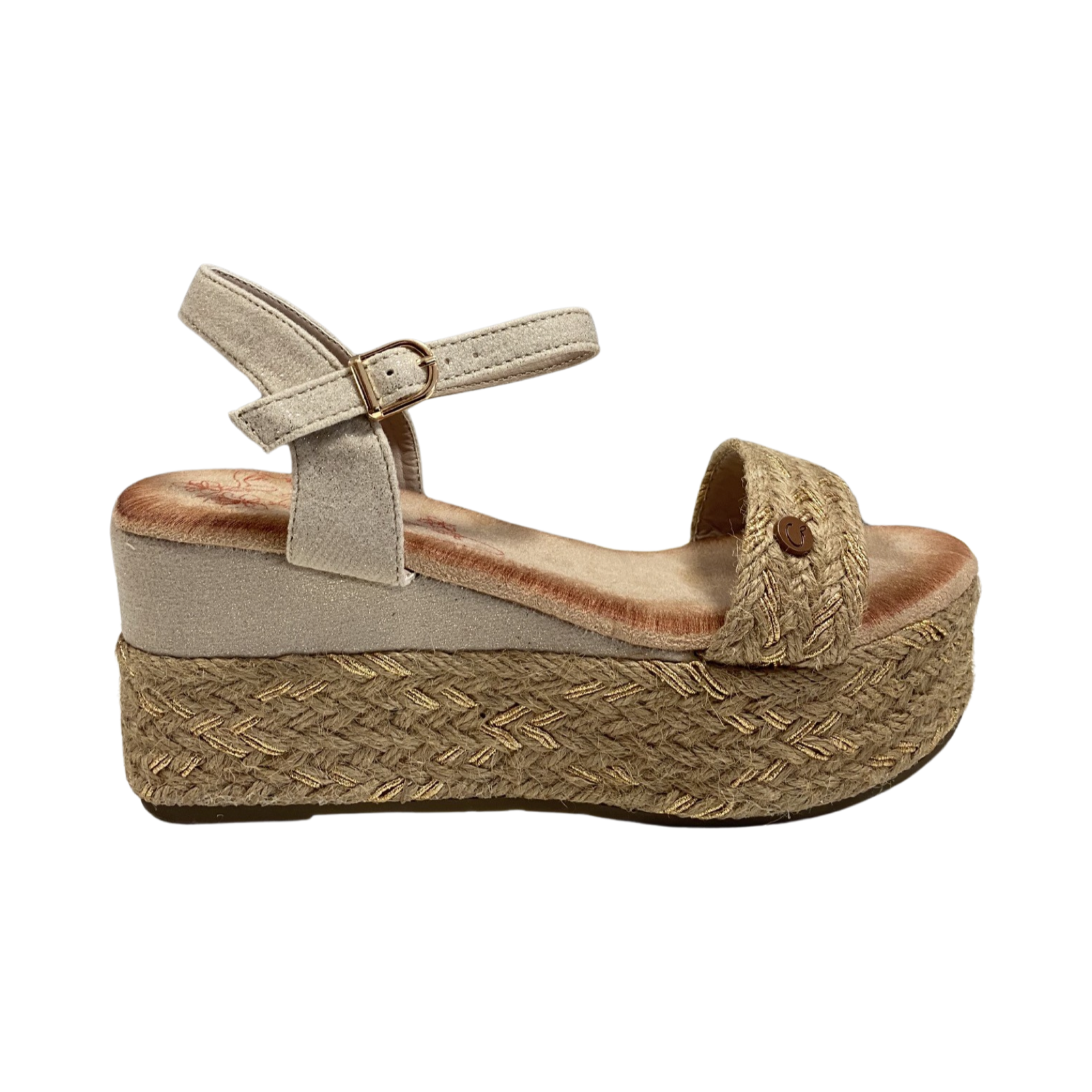 Sandalias plataforma de la marca Mandarina, fabricadas en material sintético, textil y fibra natural, suela de goma con detalles en yute, plataforma delantera de 3 cm, cuña de 5 cm, ajuste lateral con hebilla, ideales para un look fresco y chic.
