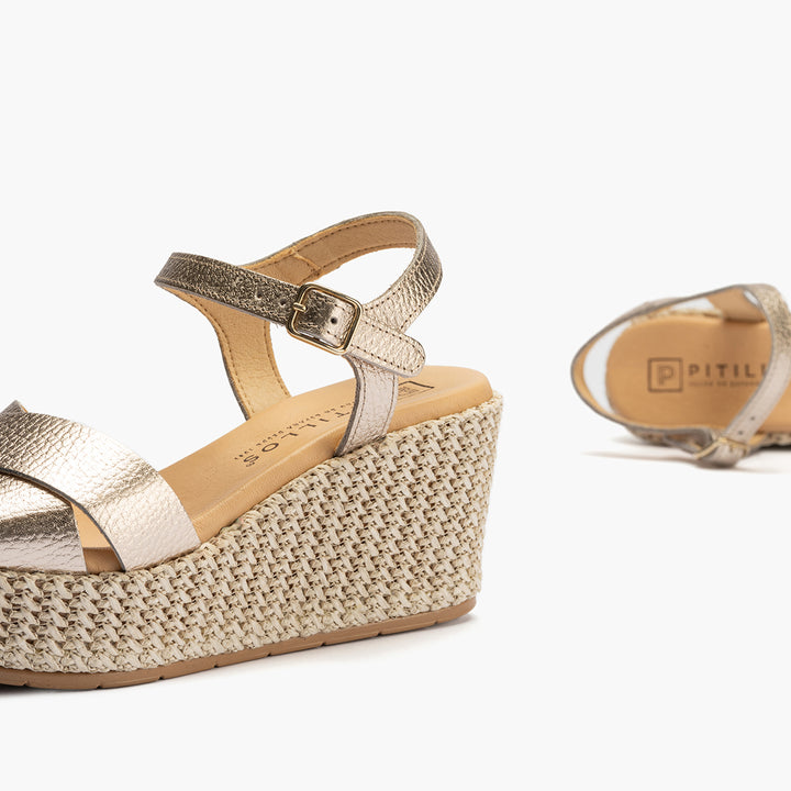 Confeccionada en Piel Laminada para un toque elegante y diferente. Altura de cuña: 7 cm. Incluye plantilla técnica textil para extra-confort y sensación térmica óptima esta primavera/verano. compuesta por fibras transpirables para máximo confort