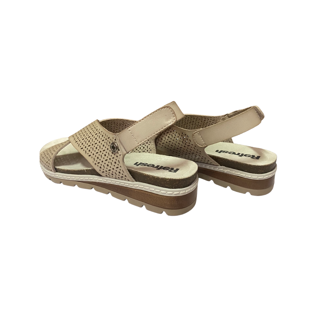 Sandalia de mujer, de la marca Refresh. Fabricada en material que imita la piel con diseño calado. Pala ancha cruzada y correa adherente. Cómoda cuña de 4 cm con suela antideslizante. Este modelo ha obtenido el certificado vegano por la organización mundial PETA (Organización de los derechos de los animales).