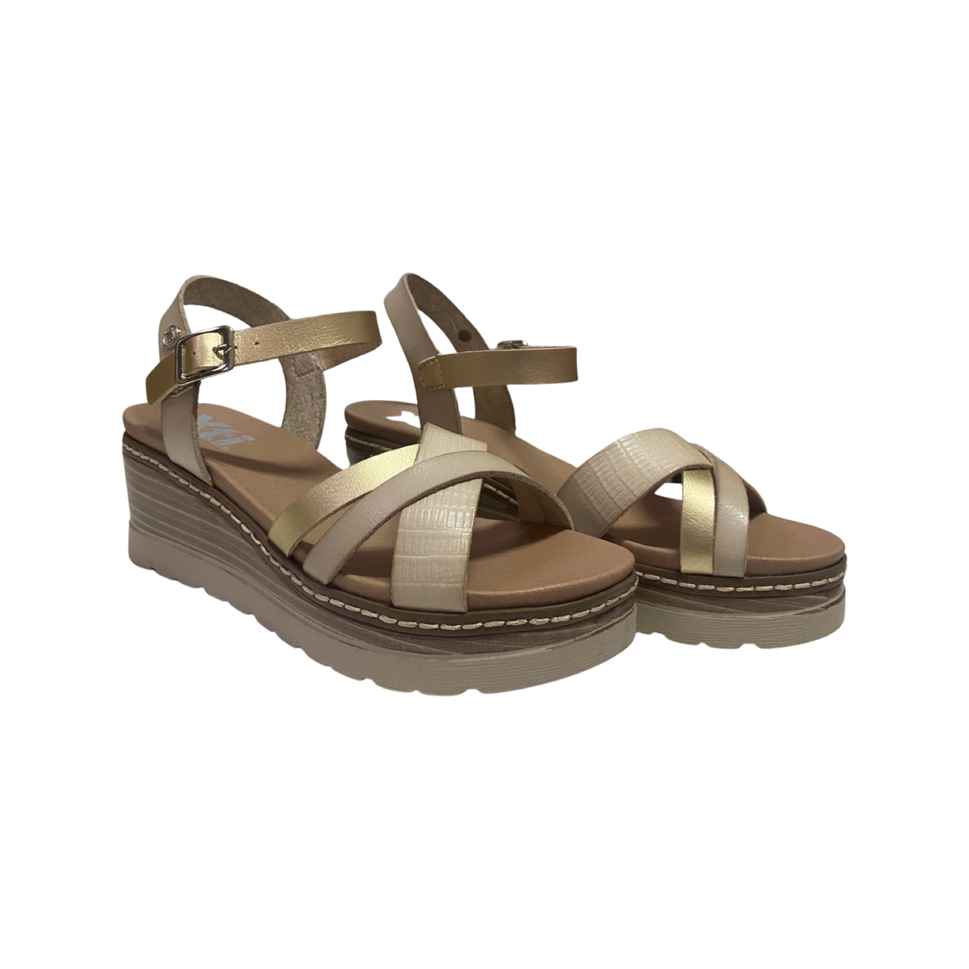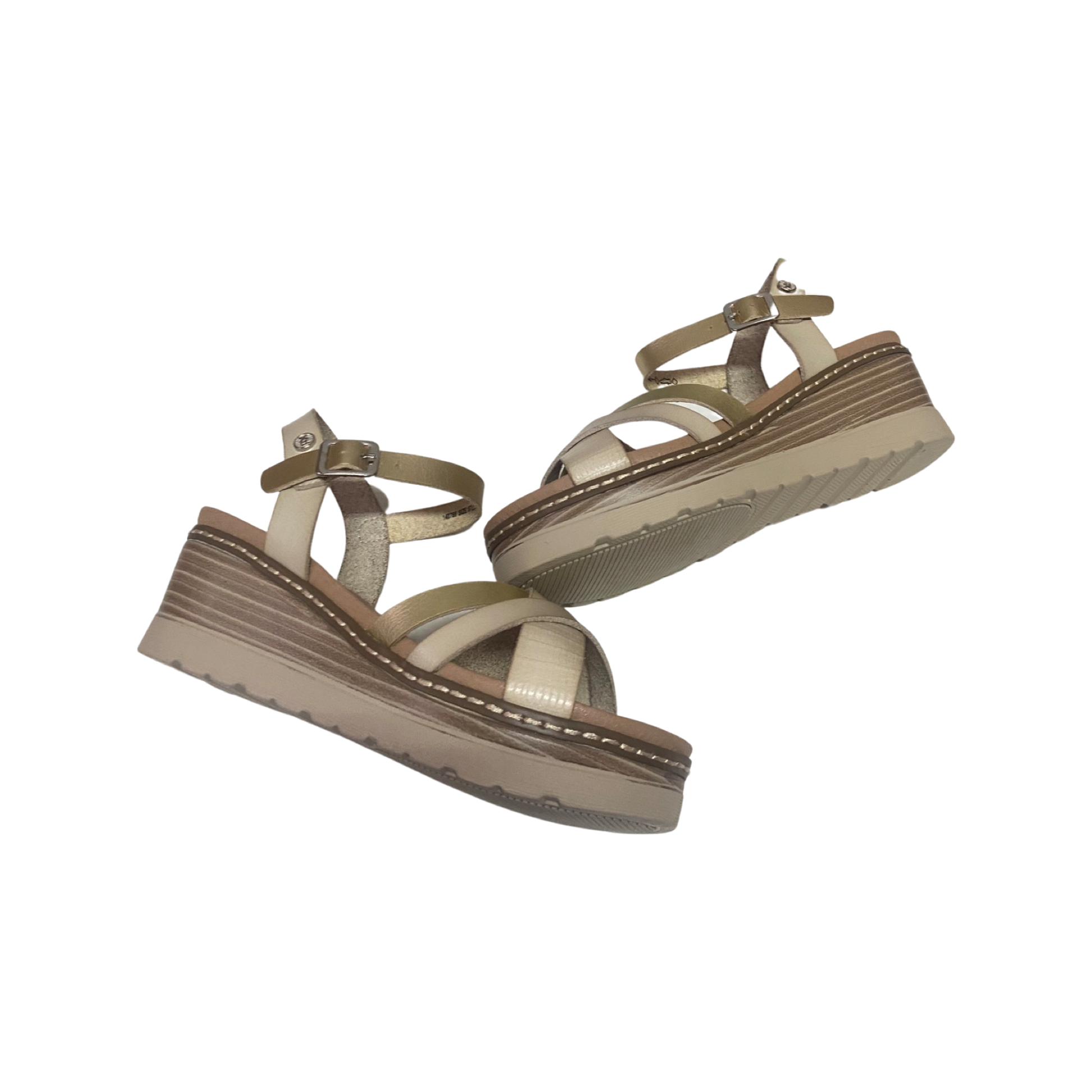 Sandalia de mujer, de la marca Xti. Diseño de tiras cruzadas con combinación de materiales que imitan la piel. Cierre mediante hebilla metálica. Cuña de 6cm con suela antideslizante. Este modelo ha obtenido el certificado vegano por la organización mundial PETA (Organización de los derechos de los animales).