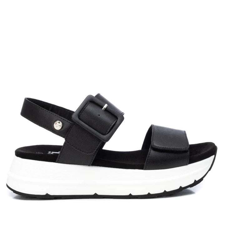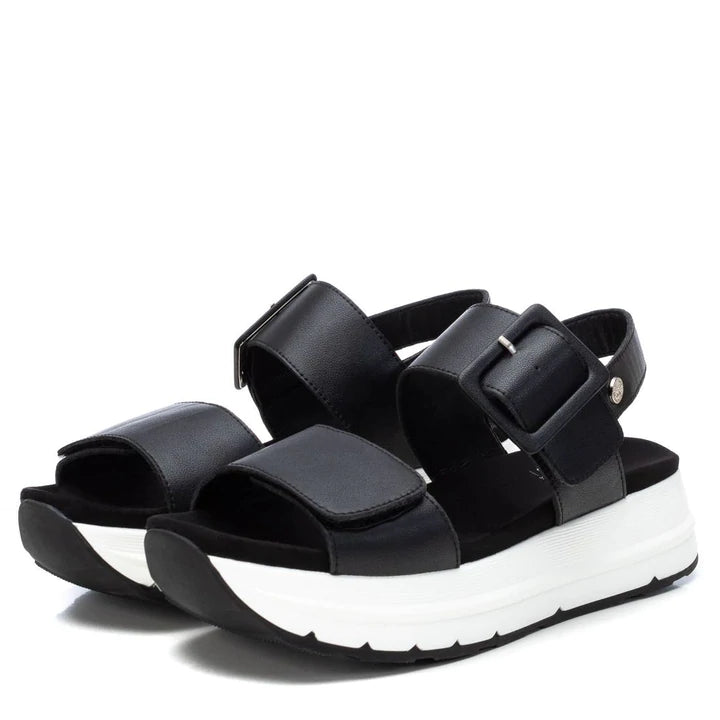 Sandalia de mujer, de la marca Xti. Fabricada en material que imita a la piel, con ancha tira delantera con cierre adhesivo, tira en el empeine con hebilla mate al tono, de la que sale tira para sujetar al tobillo. Plataforma de 5 cm de altura con un diseño actual y versátil. Comodidad y diseño unidos para crear esta sandalia que no podrá faltar en tu día a día. Este modelo ha obtenido el certificado vegano por la organización mundial PETA (Organización de los derechos de los animales).