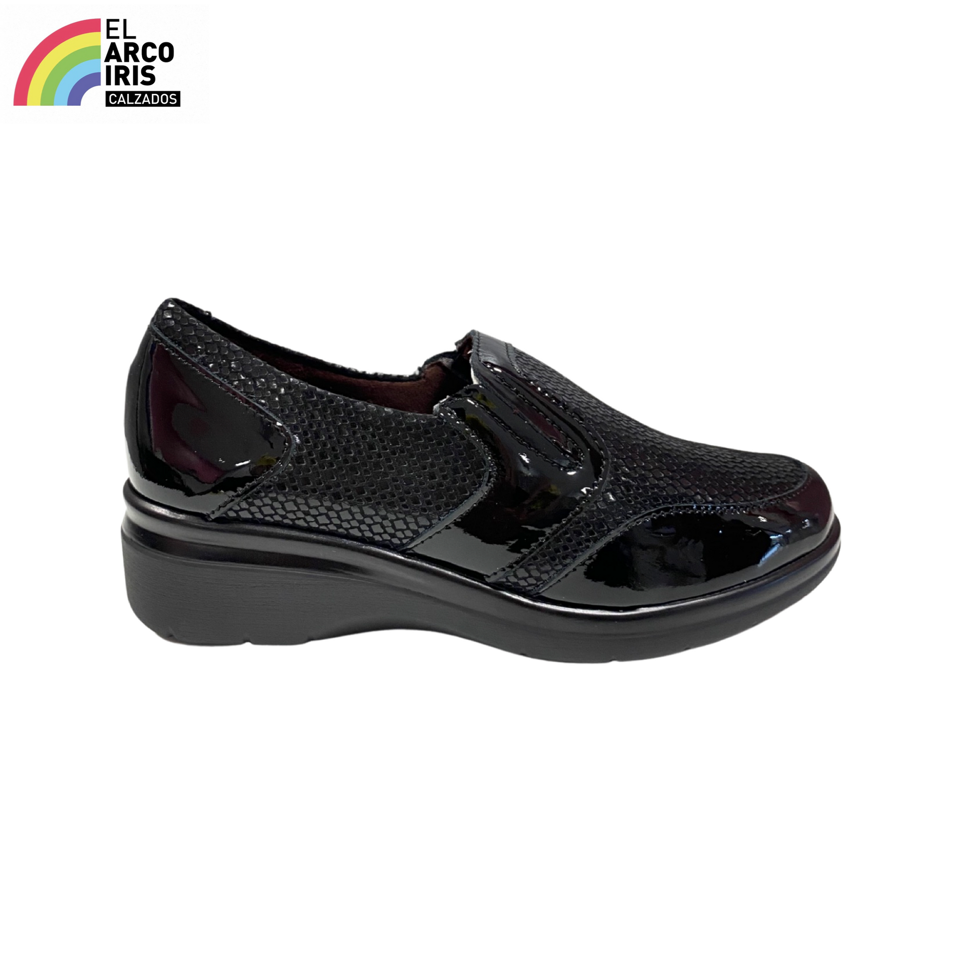 Los ZAPATOS MUJER PITILLOS 5310 NEGRO representan el lujo y la exclusividad a través de su admirable combinación de tela con charol y Lycra. La suela de poliuretano y el forro técnico textil afelpado le brindan un extra-confort insuperable para los fríos días de Otoño - Invierno. Una plantilla extraíble de alto rendimiento hará de sus pasos seguros, estables y con elegancia. El calzado negro se complementa con la cuña de 4 cm. El resultado es un look único.